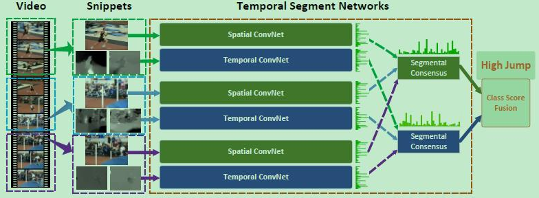 TSN1是一种基于双流(Two Stream)模型2的姿态识别方法。在原有的网络模型上,通过修改输入数据的采样方式,在样本量少的情况下,高效的实现了长视频的姿态识别。