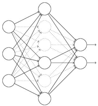 Dropout可以比较有效的缓解过拟合的发生,在一定程度上达到正则化的效果。过程其实很简单,如下两幅图所示,对中间层进行dropout,可以看到使得一般的神经元失效。